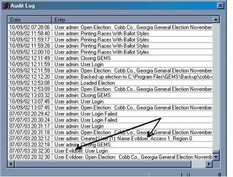 Access encourages those who create audit logs to use auto-numbering so that every logged entry has an uneditable log number. Then, if one deletes audit entries, a gap in the numbering sequence will appear. However, we found that this feature was disabled, allowing us to write in our own log numbers. We were able to add and delete from the audit without leaving a trace. Going back into GEMS, we ran another audit log to see if Evildoer had been purged: As you can see, the audit log appears pristine. In fact, when using Access to adjust the vote tallies we found that tampering never made it to the audit log at all.” — Bev Harris